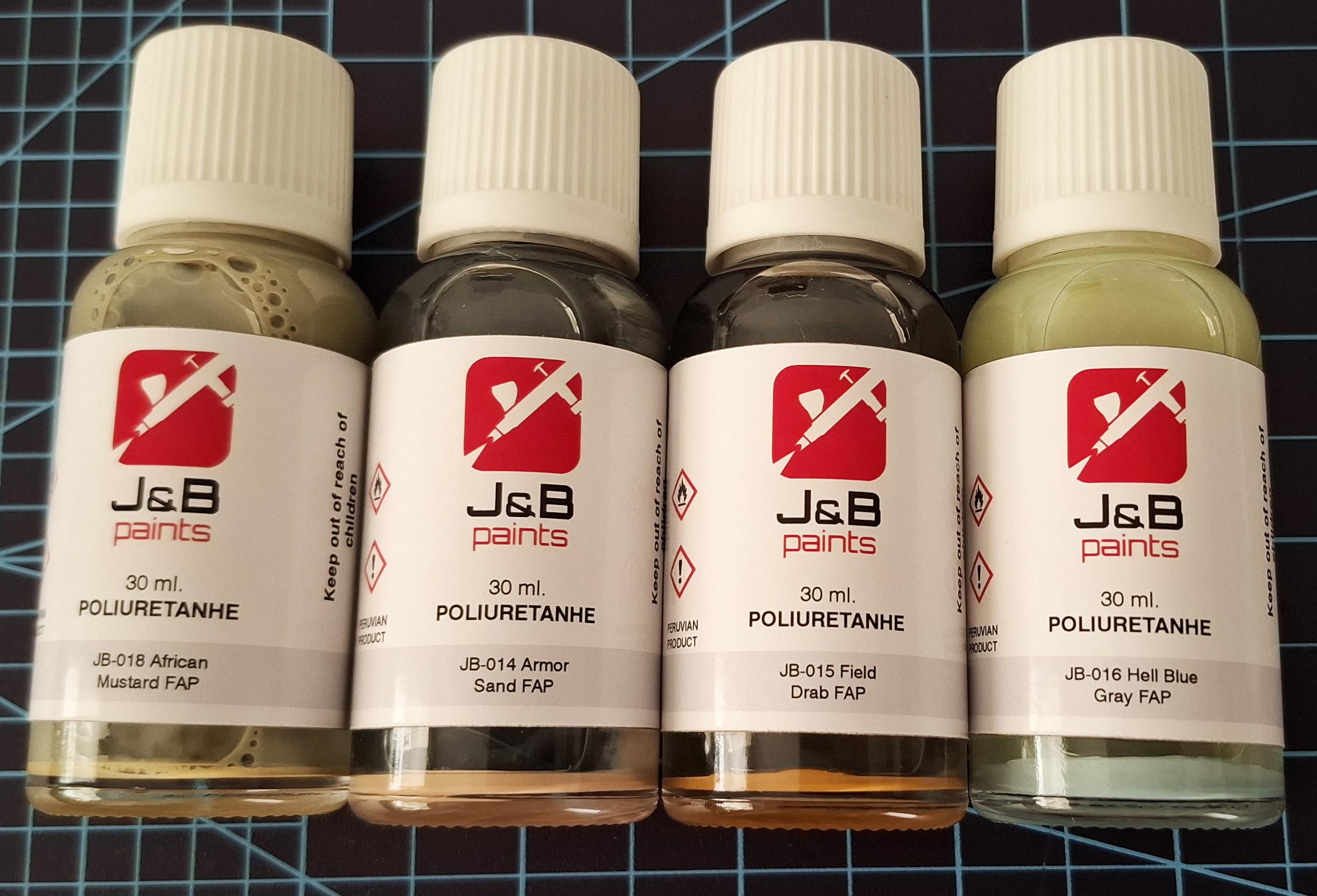 Originally wearing soviet colours, as the Peruvian Air Force Fitter fleet entered inspection and overhaul at SEMAN (mainteniance workshop) in Lima they were painted with locally made colours. This set contains 4 30ml jars with three of the four basic top color variations found on the FAP “Fitters”, plus the underside light blue-grey.
