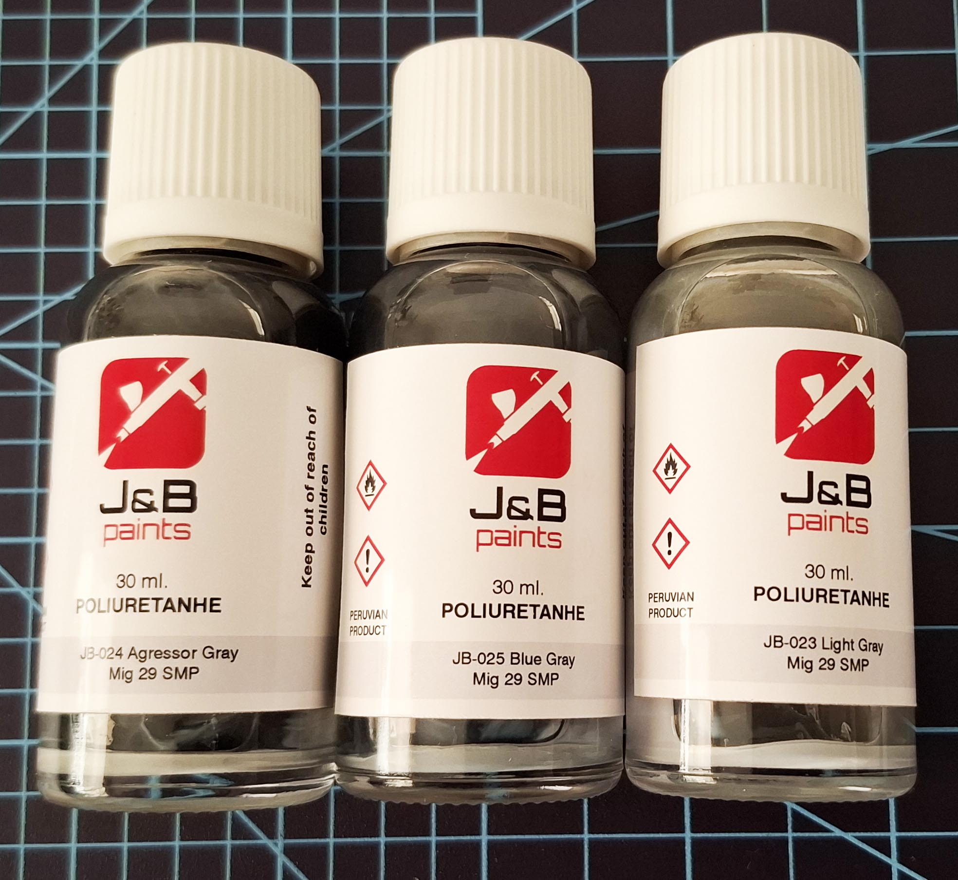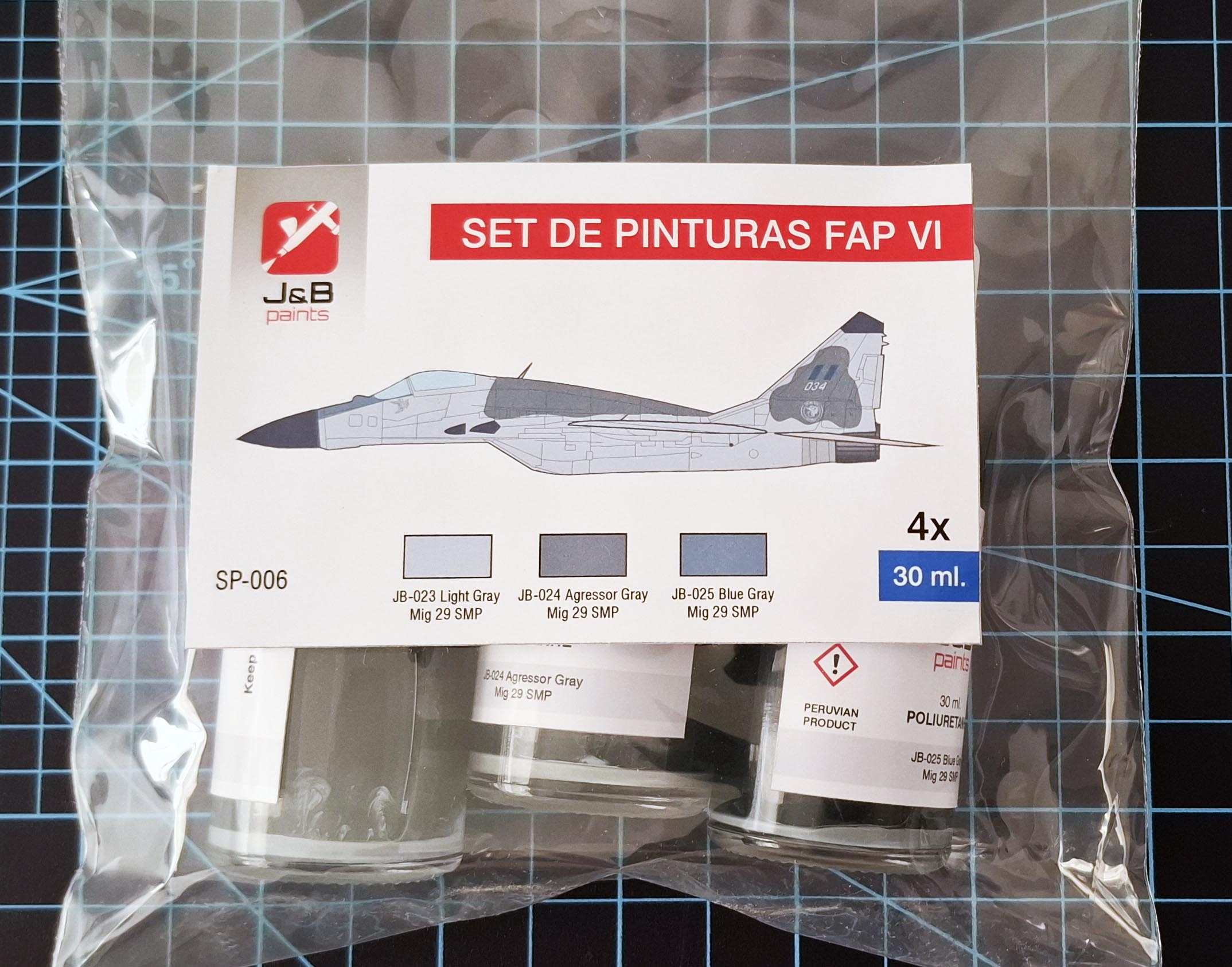 Originally wearing soviet colours, as the Peruvian Air Force MiG 29 S/SE fleet required an upgrade of its offensive capabilities the “SMP” program was launched, with a total of eight aircraft being modernized at Chiclayo (six single seat and two twin seaters), with these aircraft emerging from the upgrade program sporting a new paint scheme. This set contains 3 30ml jars with three grey tones applied to these aircraft.