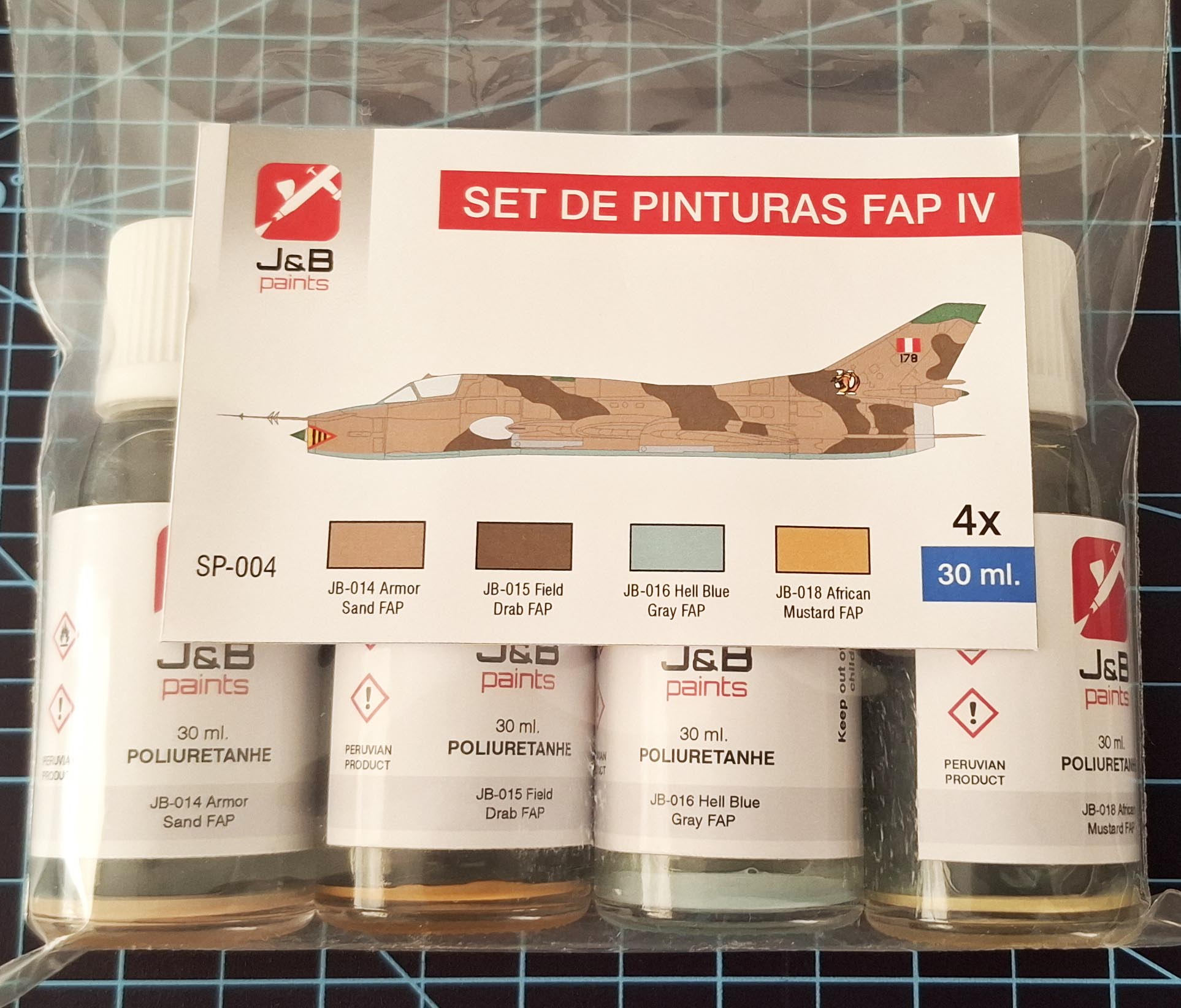 Set of three ready-to-airbrush polyurethane colours for Peruvian Air Force MiG 28 SMP upgrade.